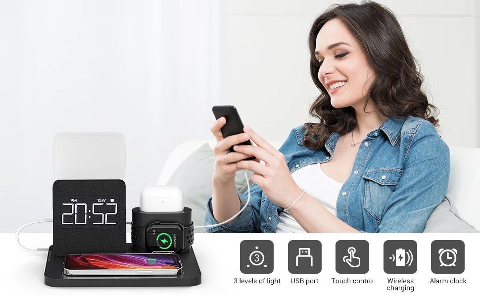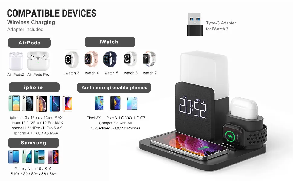 3 In 1 Fast Charging Station Wireless Charger Digital Alarm Clock Night Light Compatible for IPhone 13 Iwatch/AirPods Charging